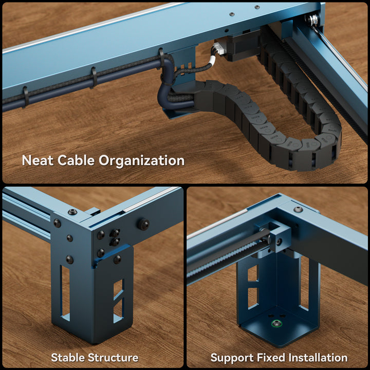 È dotata di quattro piedini di supporto e di fori fissi, utilizzando il nuovo tipo di struttura a tre assi e tre rulli. Questo design consente un funzionamento fluido e ad alta velocità e una bassa rumorosità durante il lavoro, rendendolo adatto a compiti di incisione e taglio pesanti.