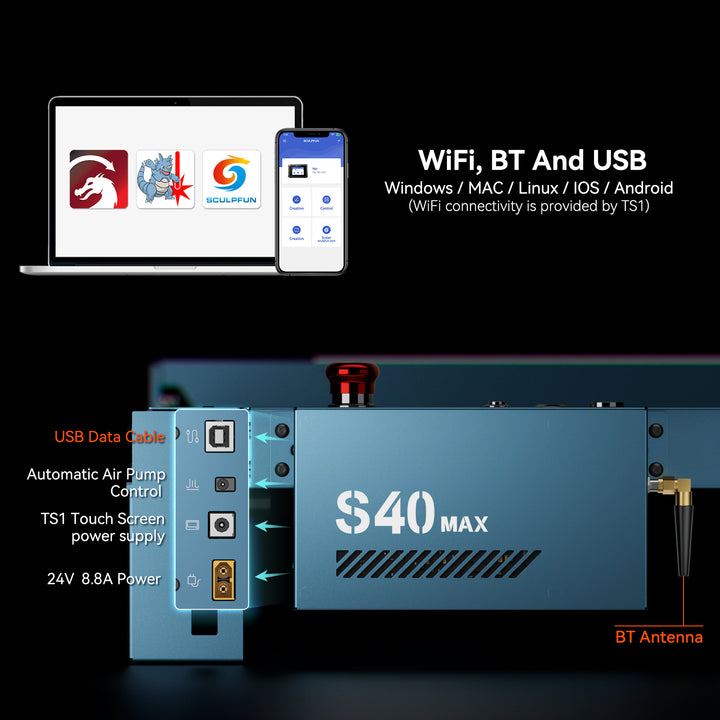 L'incisore laser S40 MAX 48W è dotato di un touch screen TS1, che consente di lavorare offline senza computer importando i file in anticipo. Inoltre, può essere collegato all'APP Sculpfun tramite il Wi-Fi del TS1 e il lavoro di taglio può essere completato con un telefono cellulare.