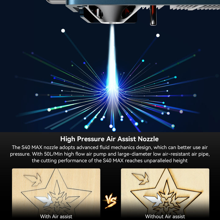 La S40 MAX è una macchina professionale per l'incisione laser che utilizza dodici chip laser a semiconduttore da 6W con una potenza massima del chip laser di 48W, che conferisce alla macchina prestazioni più elevate e garantisce un'efficienza eccezionale. Il 100% di potenza con la pompa d'aria standard da 50L ad alto flusso consente di tagliare compensato da 20 mm e acrilico scuro da 6 mm in un solo passaggio.