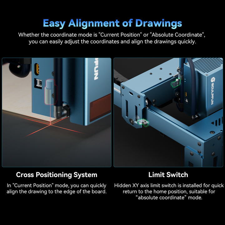 Sculpfun S40 MAX adotta la più recente tecnologia di compressione dei punti in fibra ottica, con una dimensione dei punti ultra-fine di 0,154*0,121 mm. Supporta l'offset dell'asse Z nel software LightBurn e supporta il movimento di taglio verso il basso per ogni taglio, garantendo una superficie di taglio piatta e riducendo significativamente le bruciature sulla superficie di taglio.