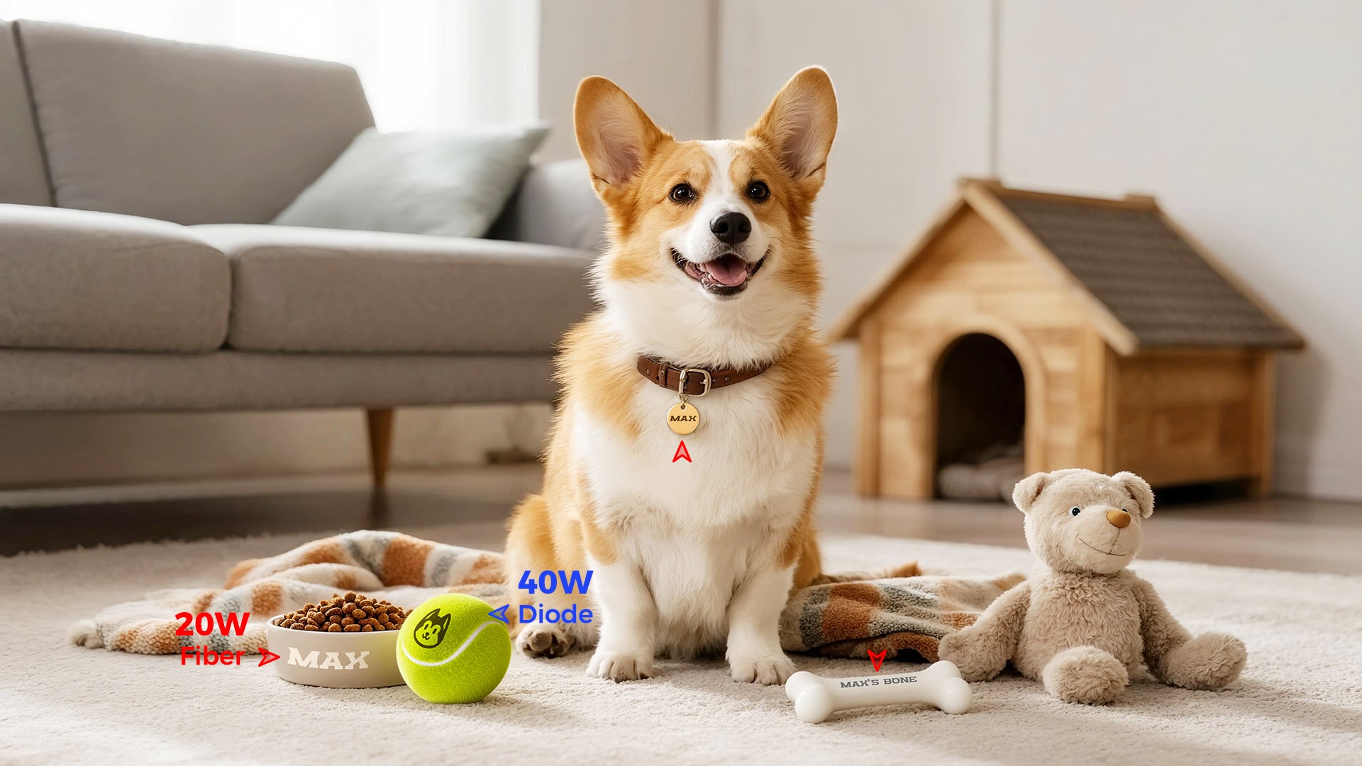 Rispetto a un laser a infrarossi da 2 W e 1064 nm, la potenza di uscita da 20 W è notevolmente più elevata, producendo incisioni più profonde e scure sul metallo con risultati superiori.